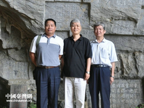 英德政協(xié)文史委林超富主任與兩位教授在碧落洞摩巖石刻前合影(圖片來(lái)源:英德市臺(tái)辦)