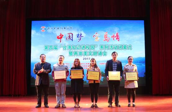 閉幕式上,市臺辦副主任李斌作了總結講話。他說,本屆“臺灣知識進校園”系列活動以“中國夢,寶島情”為主題,相繼開展了“演講比賽、電影觀賞、知識競賽、美文朗誦”等活動,覆蓋了全市五所大中專院校師生3萬多人。整個活動組織有力,特色突出,精彩紛呈,具有參與規模大、活動形式活、宣傳內容廣、教育效果好等顯著特點,較好地吸引和引導了廣大青年學生關心兩岸關系的發展,積極投身兩岸交流合作活動,為祖國的和平統一事業作出新的貢獻。特別是河職院賴小景副校長帶頭和帶領部分老師踴躍參加了兩岸美文朗誦會活動,對活動的開展給予了有力支持和促進。他表示,要繼續努力,創新發展,把“臺灣知識進校園”系列活動打造成一個富有影響力的涉臺宣傳教育品牌。