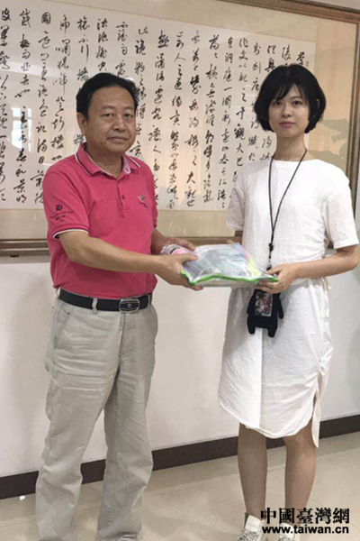 東莞市人民政府臺灣事務局副調(diào)研員謝春為2018屆赴臺陸生陳哲源致贈學習用品。(圖片來源:東莞市臺辦)