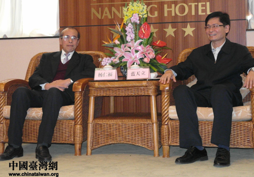 藍天立首先代表自治區黨委、政府,向參訪團表示熱烈歡迎。他說,自1999年以來,雙方少數民族交流往來頻繁熱絡,廣西連續舉辦12屆桂臺少數民族文化交流周,臺灣14個少數民族代表、楊仁福先生等多位臺灣知名人士多次到廣西參訪,與廣西少數民族開展了豐富多彩的交流活動。
