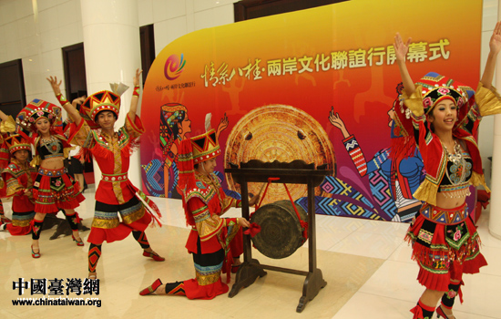 “情系八桂——兩岸文化聯誼行”聯歡晚會16日晚在南寧舉行,圖為廣西少數民族迎賓表演。(中國臺灣網 張弛 攝)