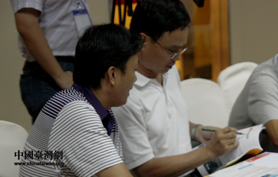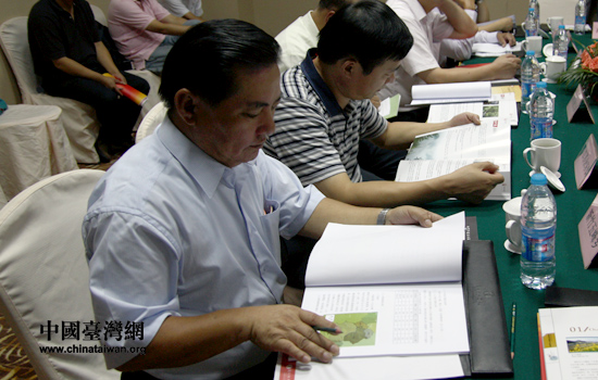 18日晚,第二屆兩岸鄉村座談舉行兩岸結對子鄉村見面會,兩岸30個鄉村代表參加。圖為參會代表在翻看結對子鄉村的有關資料。(中國臺灣網 張弛 攝)