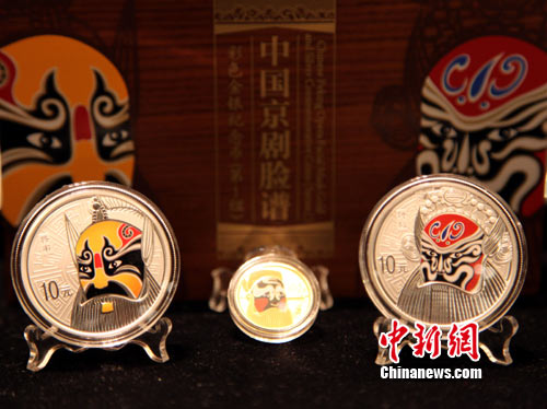 中國人民銀行發(fā)行的中國京劇臉譜彩色金銀紀(jì)念幣(第1組),其中金幣1枚,銀幣2枚,新近在臺灣面市。圖為11月16日,中國金幣總公司在臺灣的總經(jīng)銷,位于臺北市和平東路三段68之1號的臺灣大洋金銀幣公司展售的該套金銀紀(jì)念幣。據(jù)悉,由于臺灣有著不少的京劇票友,該套紀(jì)念幣很受歡迎。