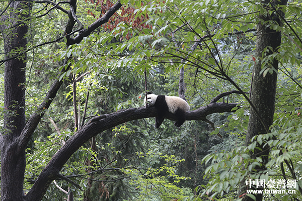 爬上樹干的幼年熊貓。(中國臺灣網 于斯文 攝)