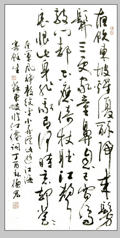 龔德宏將軍以蒼勁的行草,書寫了東坡《臨江仙·夜飲東坡醒復(fù)醉》全文,表達(dá)著不被困難和痛苦所屈服,以超人的意志從大自然中感悟人生哲理、尋求美好享受的曠達(dá)襟懷。