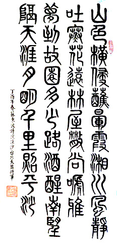 此次參加紀(jì)念東坡書法聯(lián)展活動(dòng),范以俊以行楷全文書寫蘇東坡《前赤壁賦》、《后赤壁賦》,清新豪健、端莊平穩(wěn)、大氣磅礴。陸軍總部前署長(zhǎng)李豐池少將,以鐵線篆書寫蘇東坡詞《念奴嬌·大江東去》,偶有大篆的意趣,連同楷書長(zhǎng)款,都給人一種沉靜中不失華麗的感覺。老將軍以百年人生品味大江東去,想必對(duì)蘇翁“人間如夢(mèng)”有著更深切的理解。他將一生波瀾化為勾挑回轉(zhuǎn),依然保持了對(duì)文化、對(duì)前賢的莊敬之感。臺(tái)灣空軍氣象聯(lián)隊(duì)前隊(duì)長(zhǎng)、大氣工程科學(xué)家(博士)、臺(tái)灣東森電視臺(tái)氣象主播、享譽(yù)全臺(tái)的“氣象將軍”,75歲的俞川心少將,書寫了蘇東坡遙望故園、思念母親的《浣溪沙·山色橫侵蘸暈霞》一詞,作品金文童趣偏多,筆劃沉著,結(jié)構(gòu)嚴(yán)謹(jǐn),放到專業(yè)書法家的行列去比較,同樣毫不遜色,字里行間流露著與東坡相同的鄉(xiāng)愁情懷。