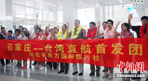 7月29日,河北飛往臺灣的直航航線正式開通。在石家莊正定機場大廳內,即將登機的河北首發團友合影留念,記錄這歷史性的一刻。至此,河北至臺灣一日生活圈已成為現實。中新社發 翟羽佳 攝