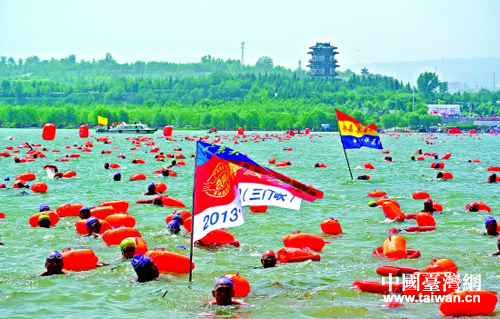 “2013中國(guó)·三門峽橫渡母親河”活動(dòng)在三門峽天鵝湖國(guó)家城市濕地公園黃河水域舉行。(圖片來(lái)源:三門峽臺(tái)辦)