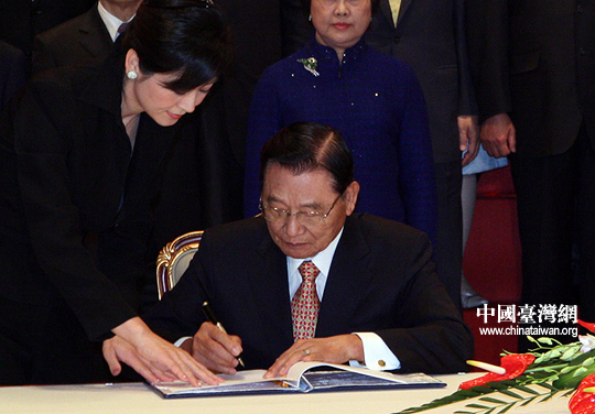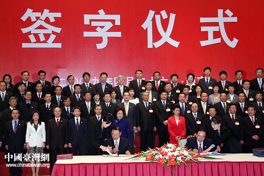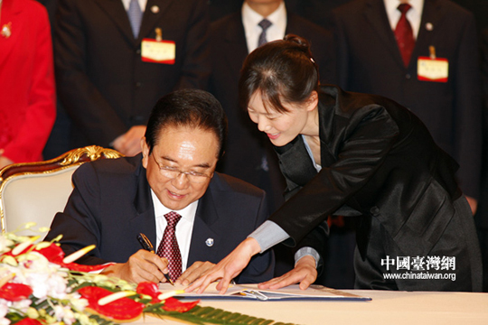 海協會會長陳云林簽署協議。26日下午三時許,海協會會長陳云林與臺灣海基會董事長江丙坤在南京紫金山莊正式簽署《海峽兩岸空運補充協議》、《海峽兩岸金融合作協議》、《海峽兩岸共同打擊犯罪及司法互助協議》。(中國臺灣網 鐘寶華 攝)