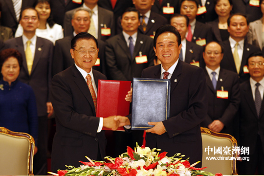 海協會會長陳云林與海基會董事長江丙坤互換協議文本。26日下午三時許,海協會會長陳云林與臺灣海基會董事長江丙坤在南京紫金山莊正式簽署《海峽兩岸空運補充協議》、《海峽兩岸金融合作協議》、《海峽兩岸共同打擊犯罪及司法互助協議》。(中國臺灣網 鐘寶華 攝)