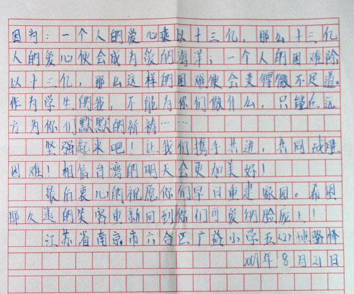 中國臺灣網(wǎng)9月22日北京消息 8月初,“莫拉克”臺風(fēng)給臺灣中南部地區(qū)造成重大的人員和財產(chǎn)損失。大陸同胞心系臺灣災(zāi)區(qū)。南京市小學(xué)生駱懌日前致信臺灣災(zāi)區(qū)的小朋友,表達(dá)了對他們的牽掛,并鼓勵災(zāi)區(qū)的小朋友們堅強(qiáng)起來,勇敢面對困難,攜手走向美好的明天。