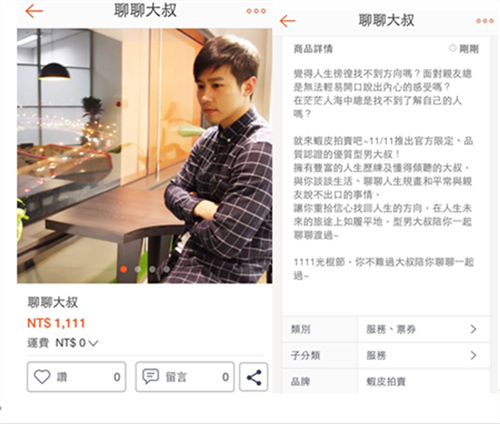 而據香港《明報》網站報道,來自新加坡的手機App“蝦皮拍賣”也趁“光棍節”在臺灣等地推出限時拍賣:“聊聊大叔”服務,由官方遴選擁有豐富人生歷練及懂得傾聽的優質型男大叔,與下標者聊聊天,讓單身者光棍節也不孤單。