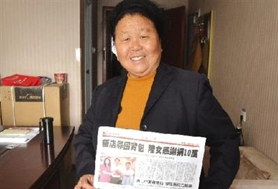 鄭州市中原區西流湖辦事處孫莊村的耿金愛女士,去臺灣旅行時,不巧背包丟失,被人拾到后歸還,包內身份證等物原封未動,耿女士當即捐出10萬元新臺幣(約合人民幣2萬元)給拾到她包的飯店員工,飯店和員工決定把10萬新臺幣捐給相對困難的區公所,當做該所的老人幸福食堂基金,耿女士的愛心之舉登上了當地報紙頭條。