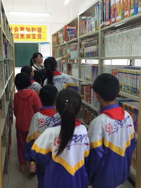 鵝公鎮中心小學的學生在老師帶領下進入圖書室借書