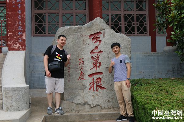 臺灣學生與翁宗慶題詞碑合影留念。(圖片來源:日照市臺辦)