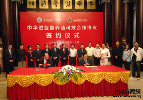 中國臺灣網10月17日上海消息 日前,上海海洋大學校長潘迎捷與臺灣苗栗縣長劉政鴻在上海西郊賓館簽約,雙方約定合作在苗栗縣發展中華絨螯蟹(俗稱大閘蟹)養殖事業。中共上海市委常委楊曉渡、上海市臺辦主任李文輝、市教委主任薛明揚、海洋大學黨委書記虞麗娟等出席見證。