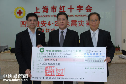 上海市臺協向蘆山地震災區捐百萬賑災款