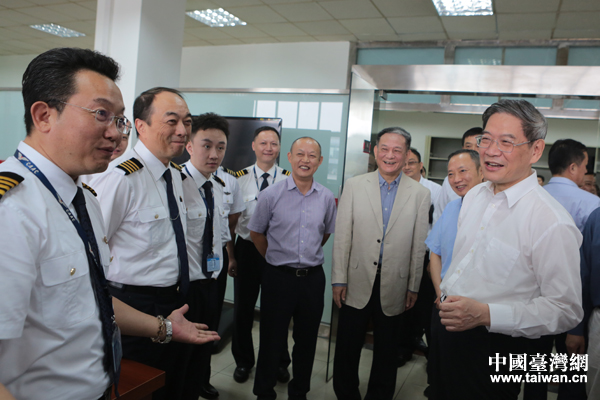9月12日,張志軍抵達(dá)成都后,從停機(jī)坪直接前往四川航空公司機(jī)場基地,看望正在這里做飛行準(zhǔn)備的臺籍飛行員。(中國臺灣網(wǎng) 于斯文 攝)