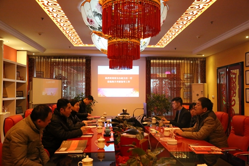 四川省臺辦副主任趙宇(左二)在自貢市海天彩燈公司座談