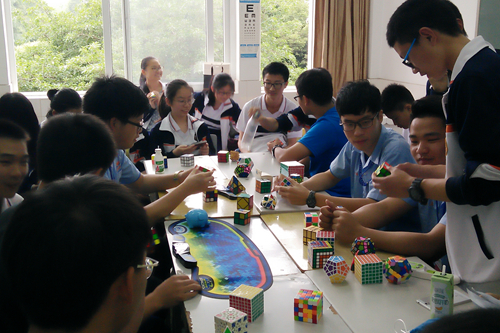 和結(jié)對(duì)伙伴一起,臺(tái)東高中的同學(xué)們走進(jìn)樂(lè)山一中的教室,感受不一樣的課堂。隨后,大家又來(lái)到運(yùn)動(dòng)場(chǎng),跟著體育老師練起了中華武術(shù),體驗(yàn)歡樂(lè)生動(dòng)的陽(yáng)光體育課。下午,大家還來(lái)到社團(tuán)活動(dòng)教室,航模社、攝影社、魔方社、DIY工坊、實(shí)驗(yàn)化學(xué)社、印色荼章、模擬聯(lián)合國(guó)……豐富多彩的社團(tuán)生活,讓臺(tái)東高中的同學(xué)們樂(lè)在其中。