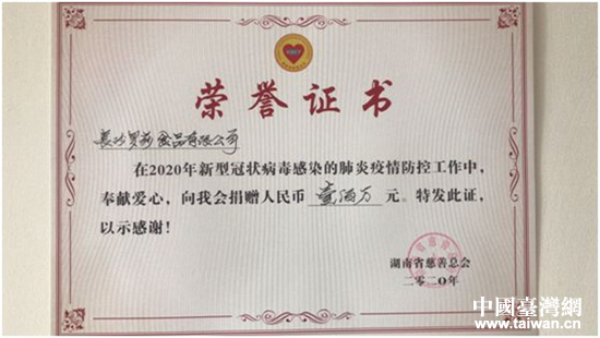 在湘臺商、臺企積極參與湖南抗擊疫情阻擊戰:湖南旺旺醫院是指定的市級定點救治單位,發熱門診24小時開放,全院臺灣醫生為抗擊疫情沒有回臺灣。且據不完全統計,截至目前,在湘臺商、臺企為抗擊疫情捐款捐物折合人民幣近600萬元。