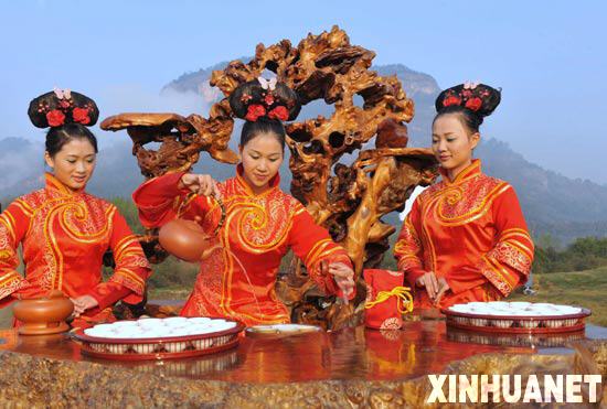 11月16日,三位姑娘在風(fēng)光秀麗的武夷山大王峰下表演茶藝。 當(dāng)日,第二屆海峽兩岸茶業(yè)博覽會(huì)在福建武夷山拉開帷幕。海峽兩岸6000多名茶商、茶農(nóng)以及茶業(yè)專家相聚武夷山下,以茶會(huì)友,共敘親情,以一脈相承的茶文化為橋梁和紐帶,拓寬旅游、經(jīng)濟(jì)等領(lǐng)域的廣泛合作,推動(dòng)兩岸經(jīng)濟(jì)文化繁榮。 新華社記者張國(guó)俊攝