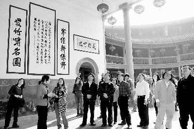 東南網-福建日報2月1日訊(劉永良 文/圖) 1月29日至30日,以臺灣大學客家研究中心主任邱榮舉為團長的“客家學與兩岸發展研究團”一行18人到永定考察了世界遺產福建(永定)土樓(如圖)、胡文虎紀念館,還與永定縣相關部門舉行“永臺客家文化交流座談會”,就兩岸客家文化的發展現狀、永臺客家關系、土樓文化、推進永臺客家文化交流合作等專題進行交流研討。