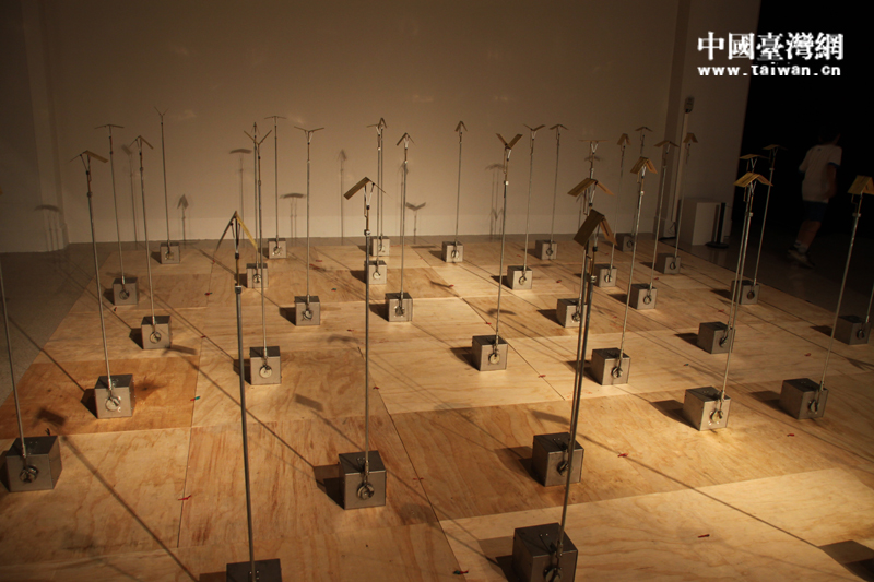 臺灣藝術(shù)家徐瑞憲的作品“旅行者之翼”用金屬、銅片、馬達(dá)、電線、變壓器、感應(yīng)器等制作,只要有人走近,金屬片就會煽動象征車票般的翅膀,從而實現(xiàn)與觀者的互動,堪稱神奇。(中國臺灣網(wǎng) 蕪?fù)?攝)