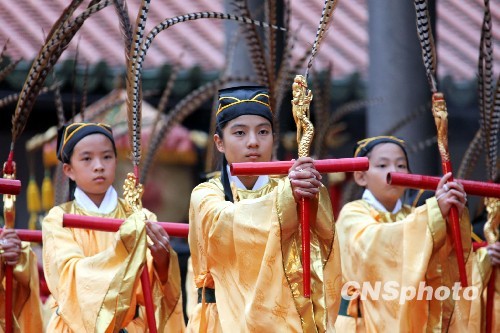 9月28日清晨,臺北孔廟隆重舉行祭孔大典,紀(jì)念孔子誕辰2559周年;顒幼裱瓊鹘y(tǒng)古禮儀節(jié),分37步驟。圖為多年來擔(dān)任佾生的臺北大龍小學(xué)生,以六佾舞行獻(xiàn)禮,展現(xiàn)“誠于中,形于外”的姿儀,表達(dá)對孔子的尊崇與贊頌。