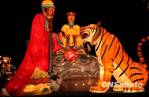 圖為根據(jù)中國古代傳說制作的花燈“保生大帝醫(yī)虎喉”。中新社發(fā) 耿軍 攝