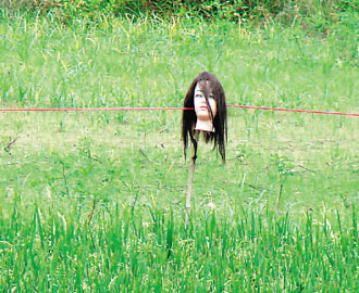 臺南縣新化鎮一處稻田以假人頭趕鳥,遠遠看像是披頭散發的女子頭浮在半空中。