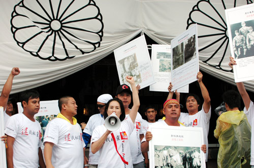 資料圖:2009年8月11日,高金素梅(拿麥克風者)率領“還我祖靈隊”約50人首度成功“突襲”進入日本靖國神社正殿前的大廣場。 “中央社”圖