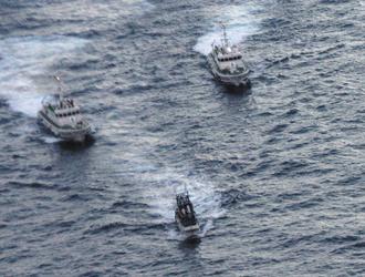 臺灣保釣船野柳籍“感恩九十九號”(中)十四日凌晨在釣魚島附近海域,遭到日本海上保安廳兩艘船艦包夾驅(qū)離。