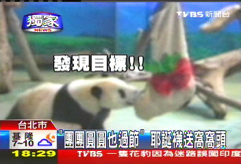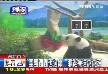 據(jù)臺(tái)灣TVBS報(bào)道,過圣誕節(jié)的傳統(tǒng)習(xí)俗,是在長襪里放驚喜禮物,來臺(tái)灣2年的大熊貓團(tuán)團(tuán)圓圓,今年應(yīng)景過起圣誕節(jié),收到一個(gè)特制的大圣誕襪,里面全是它們愛吃的胡蘿卜、窩窩頭等點(diǎn)心。