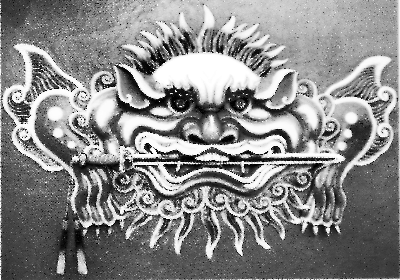 劍獅圖案源自閩南的民間避邪物,歷史上廣泛流傳于海峽兩岸。臺南安平是臺灣西部沿岸港口城市,為三面臨海沙嶼,是早期大陸移民最多的聚居地,因地狹人稠,住宅櫛比而立,巷道狹小,民居檐角交錯而建,當地居民為破解建筑風水上的忌諱,遂在門面或門檐、照壁,裝飾了諸如劍獅、獅面等避邪之物。