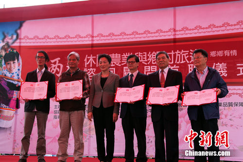 4月1日,“兩岸鄉(xiāng)村休閑旅游嘉年華”在臺(tái)灣苗栗縣飛牛牧場(chǎng)開幕。 活動(dòng)由福建省旅游協(xié)會(huì)、臺(tái)灣鄉(xiāng)村旅游協(xié)會(huì)、臺(tái)灣休閑農(nóng)業(yè)發(fā)展協(xié)會(huì)、臺(tái)灣旅行業(yè)品質(zhì)保障協(xié)會(huì)聯(lián)合主辦。圖為福建方面聘任臺(tái)灣休閑農(nóng)業(yè)發(fā)展協(xié)會(huì)顧問邱涌忠、臺(tái)灣休閑農(nóng)業(yè)學(xué)會(huì)創(chuàng)會(huì)理事長(zhǎng)陳昭郎、臺(tái)灣鄉(xiāng)村協(xié)會(huì)理事長(zhǎng)鄭健雄等人為兩岸休閑農(nóng)業(yè)與鄉(xiāng)村旅游咨詢顧問,希望專家學(xué)者能夠?yàn)楦=ㄠl(xiāng)村旅游發(fā)展獻(xiàn)計(jì)獻(xiàn)策。(左3)為福建省旅游協(xié)會(huì)會(huì)長(zhǎng)朱華。