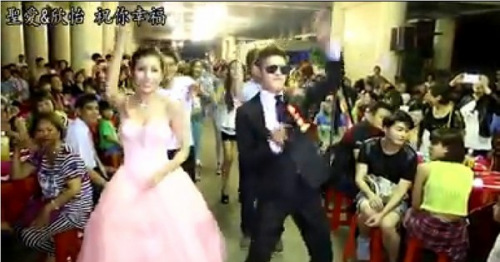這段3分半鐘的影片里,新郎穿著帥氣的西裝、戴著墨鏡,而新娘則穿著粉紅色大裙,盡管禮服十分厚重,但依然沒有影響到她靈活的身段,時而舉起雙手、身體律動,時而拉起裙擺轉圈,有時動作太快還成了殘影。