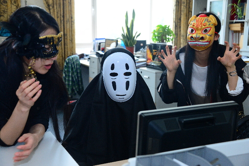9月23日,當你走進杭州宋城景區的辦公大樓,會驚奇地看到所有的員工都戴上了各式面具在工作。