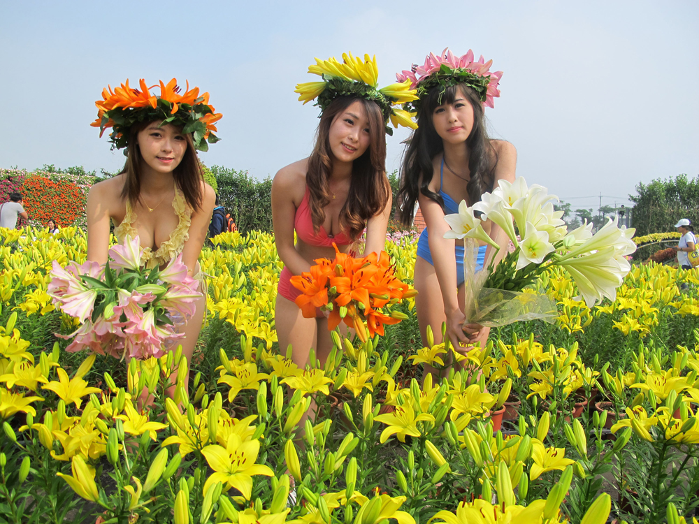 臺中后里區中社觀光花市自荷蘭引進50多種百合花球莖,利用低溫技術,讓百合花提前一個月開花,29日開幕式上,請來比堅尼辣妹與百合花爭艷。圖片來源:臺灣“中央社”
