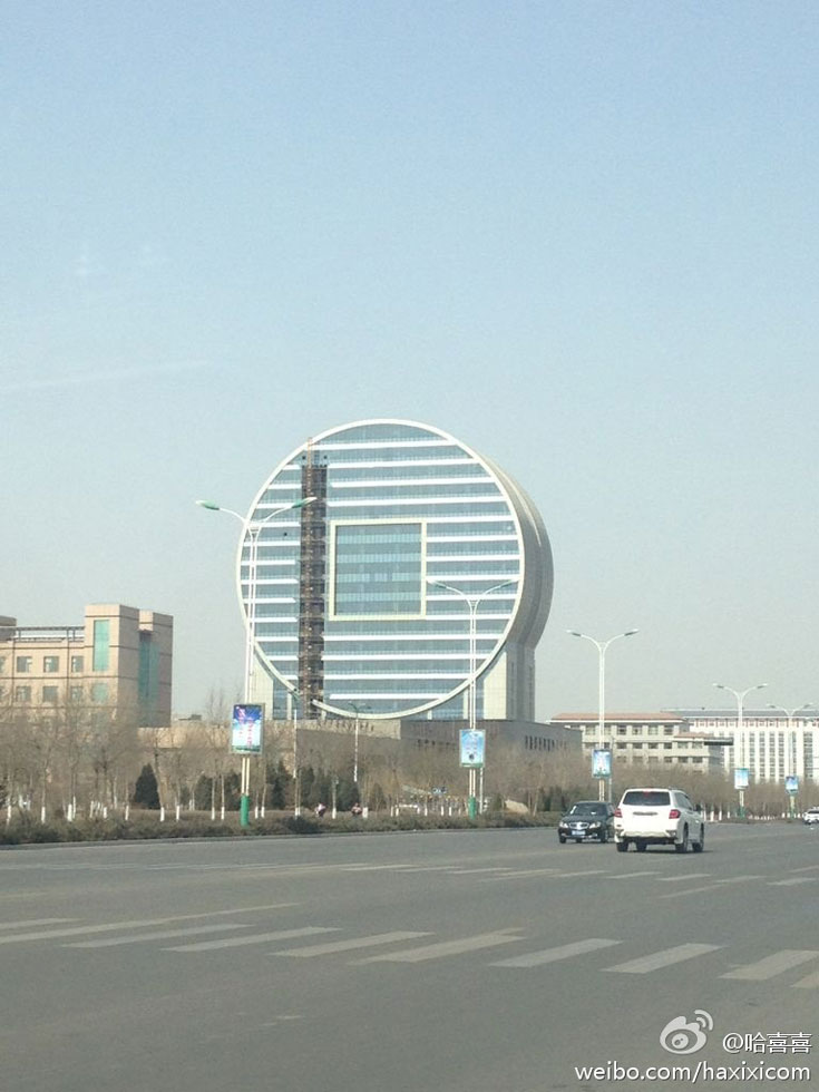 2015年11月23日,寧夏回族自治區(qū)平羅縣民族大街旁,有一幢獨特造型的大樓很吸引人的眼球。大廈兩面呈立面圓形結(jié)構(gòu),造型酷似古代使用的“銅錢”,但也有路過市民說,這棟大樓的造型很像大鼓。(圖片來自網(wǎng)絡(luò))