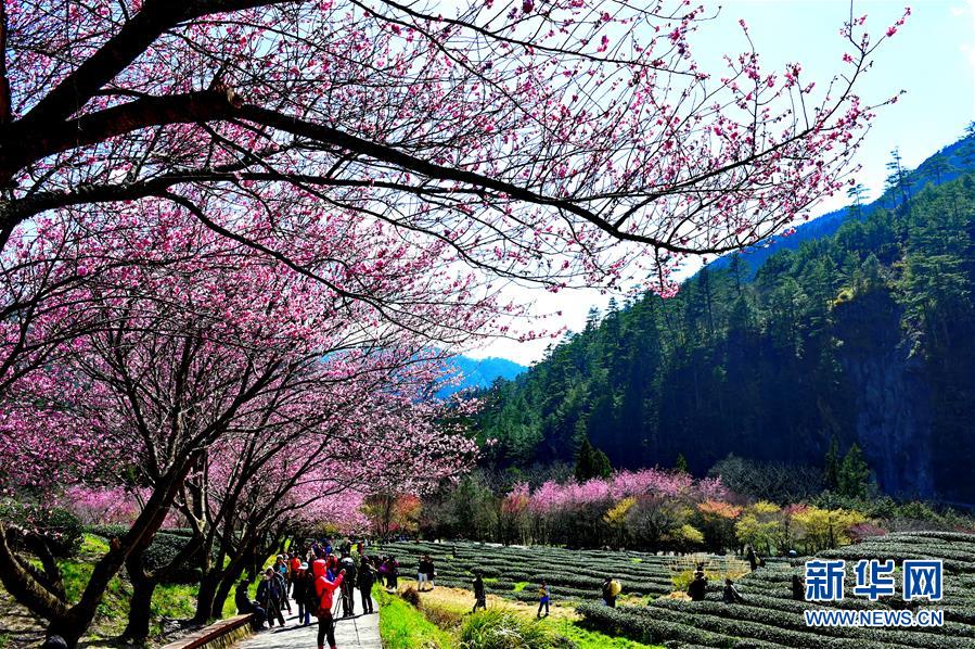 2月29日,游客在武陵農場茶園觀賞櫻花。初春的臺灣,氣溫回升,位于海拔1700多米的臺中武陵農場,漫山遍野的櫻花競相開放,美不勝收,吸引了四面八方的游客前來觀賞。 新華社記者張國俊 攝