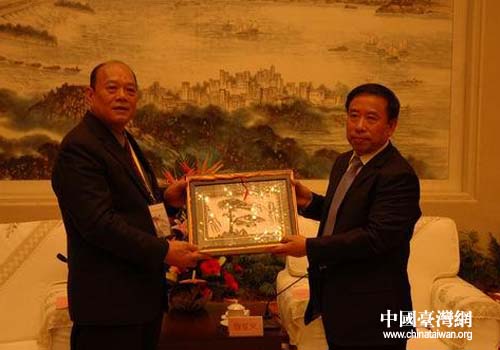 安徽省委常委、省委秘書長詹夏來向臺灣云林縣議員參訪團贈送禮品(圖片來源:安徽省臺辦)