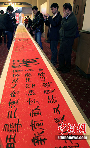 圖為年度漢字揭曉儀式上,兩岸書法藝術家共同在20米長卷上書寫此次評選的漢字并賦詩。中新社記者 關向東 攝