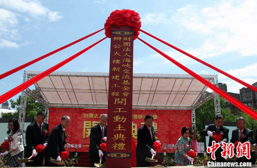 資料圖:2010年9月25日,臺灣海基會新辦公大樓在臺北市中山區開工動土。圖為臺灣行政當局負責人吳敦義(左4)、海基會董事長江丙坤(右4)、“陸委會主委”賴幸媛(左1)、辜振甫先生夫人辜嚴倬云女士(右3)與各界人士共同出席動土典禮,祝賀海基會有了“新家”。中新社發 劉舒凌 攝