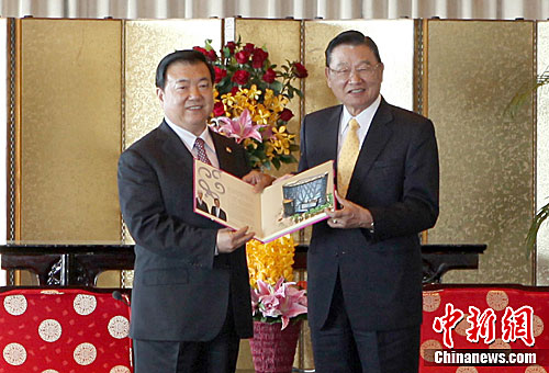 安徽省長王三運率領的“安徽經貿文化寶島行”參訪團,4月18日午間抵達臺北,將展開為期8天的交流活動。圖為王三運(左)抵臺后,在臺北圓山飯店會見臺灣;鶗麻L江丙坤。中新社發 路梅 攝