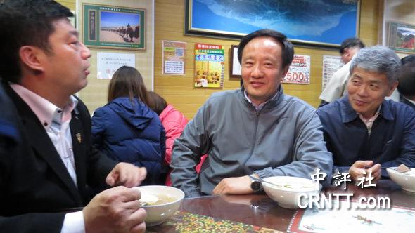 寧夏回族自治區黨委書記李建華率團訪臺,特別參訪寧夏夜市。右為黨委副書記崔波;左一為寧夏夜市觀光協會會長林定國。(中評社 倪鴻祥攝)