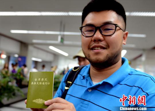 7月1日,搭乘MF880航班從臺北桃園飛抵福州長樂國際機場的臺胞劉剛瑋展示臺胞證。大陸對臺灣同胞免簽注政策7月1日起正式實施。臺胞持有效臺灣居民來往大陸通行證(臺胞證)即可經(jīng)開放口岸來往大陸并在大陸停居留,無需辦理簽注!⒖筛z