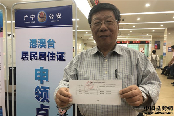 中國臺灣網9月6日肇慶訊 9月1日上午,廣東省肇慶市臺商協會會長林谷豐帶領11名臺灣同胞來到肇慶市廣寧縣行政服務中心,在通過簡單的填表、錄制指紋后,就拿到了居住證領取憑證!坝辛司幼∽C之后,解決了我們外出搭乘高鐵不能自助取票的問題,在經商投資方面也更方便,我會動員我們臺商協會的成員來申領這個居住證!绷止蓉S還說,“居住證的發放,是一項十分便民的措施,是落實惠臺31條和踐行“兩岸一家親”理念的具體體現!