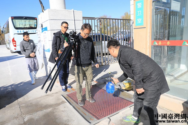 進入嘉一香食品廠的人員、車輛必須經過消毒。(中國臺灣網 李奕均 攝)