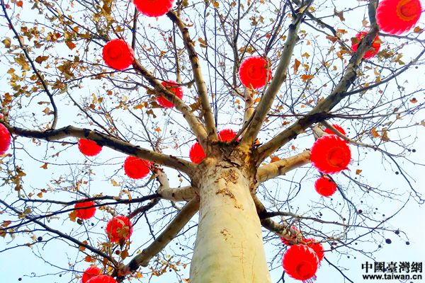 過年了,道路兩旁的小樹上掛著好多紅燈籠,增添了春節(jié)的氣氛。(中國臺灣網(wǎng) 盧佳靜 攝)